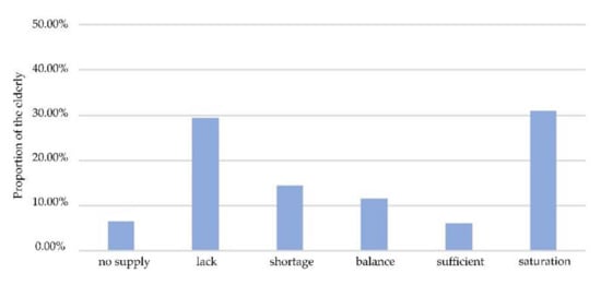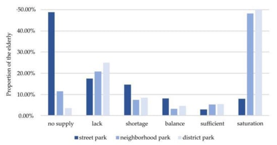 The street parks are smaller in scale, and their supply capacity is weaker than district parks and neighborhood parks. Of the elderly, 78.34% were in a state of “lack” or worse when travelling on foot. Among them, the proportion of elderly people with “no supply” was the highest at 48.91%, while 14.73% and 14.70% of elderly people were in a state of “lack” and “shortage”. Only 18.9% of the elderly have been better satisfied with their needs for street parks.