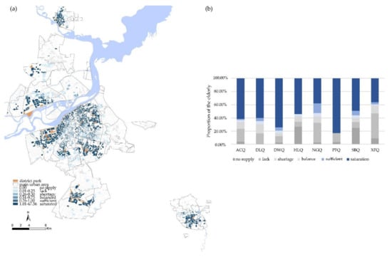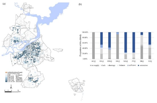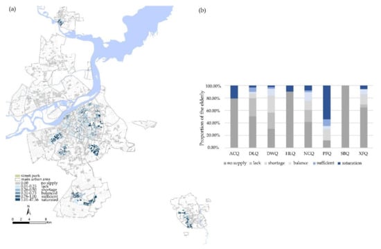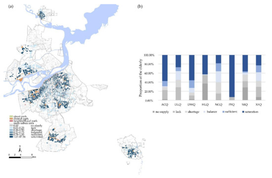Figure 10a shows the spatial distribution of integrated equity. At the district-level, the equity of Daoli District, Nangang District and Xiangfang District was better than other areas. In Figure 10b, we can see that these areas had a high proportion of “balance” and a small proportion of “saturation”. This is because the distribution of urban parks in these areas is balanced and good provision of district parks compensated the lack of street parks. The equity results in Hulan and Songbei districts were mainly concentrated in the extreme conditions of “lack” and “saturation”, where only a few urban parks were placed. The proportion of “saturation” was higher in the Acheng, Daowai and Pingfang districts, but there were about 20% of the elderly who were in a poor balance.