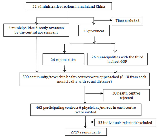 A multi-stage stratified sampling strategy was adopted to select survey participants (Figure 1). At the first stage, two municipalities from each of the 26 provinces were identified: the capital city and the city with the third-highest GDP in its respective province. At the second stage, 500 community health centres were identified from the 52 provincial-overseen municipalities and the 4 central-overseen municipalities: 8 to 10 community health centres with an equal geographic distance in each municipality. An invitation letter was sent to the selected centres, asking for support from the senior managers. Each was asked to report the adoption of EMRs in the centre and invite six health workers (physicians and nurses registered with the local health authorities) to participate in the online survey. It was up to the senior managers to decide the ratio between physician and nurse respondents. This resulted in a total of 2719 valid respondents from 462 community health centres. Of the returned questionnaires, 2213 were submitted by physicians and 506 were from nurses. They represented about 19.6% of physicians and 4.4% of nurses employed by the participating community health centres.