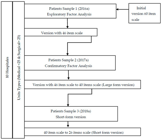 The sampling was carried out in a stratified, consecutive manner by (1) hospital size and (2) type of unit. Ten hospitals were finally included (3 Primary, 3 Specialties and 4 Tertiary) and the unit types were classified into Medical (n = 25) and Surgical (n = 25) units. We needed three different samples according to the validation process: sample (1) Exploratory Factor Analysis, sample (2) Confirmatory Factor Analysis and sample (3) Short-form version.