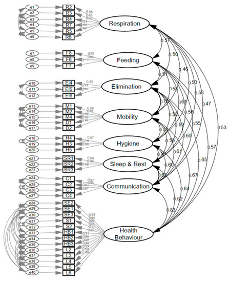The eight factors were: (1) Respiration (6 items), (2) Feeding (3 items), (3) Elimination (3 items), (4) Mobility (5 items), (5) Hygiene (3 items), (6) Sleep and rest (3 items), (7) Communication (4 items), and (8) Health behaviors (13 items). The fitness of this model yielded the following values: (Chi Square on Degrees of Freedom CMIN/DF = 1.335 (p = 0.22); NFI = 0.998; TLI = 0.999; CFI = 0.999; RMSEA= 0.02; and SRMR = 0.027. Cronbach’s alpha of each dimension was: Respiration = 0.96; Feeding = 0.92; Elimination = 0.93; Mobility = 0.97; Hygiene = 0.93; Sleep and Rest = 0.98; Communication = 0.98; and Health behaviors =0.98.