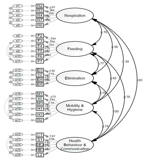 The factors isolated in the model were (1) Breathing (five items), (2) Feeding (six items), (3) Elimination (five items), (4) Mobility (six items), and (5) Perception and health behaviors (five items). This version obtained appropriate adjustment parameters: Chi Square on Degrees of Freedom CMIN/DF = 1.385; NFI = 0.998; CFI = 0.999; RMSEA = 0.02; and SRMR 0.02. Cronbach’s alpha coefficient of each dimension of the 26-item version was: Respiration = 0.96; Feeding = 0.93; Elimination= 0.90; Mobility = 0.94; and Health behaviors and communication = 0.94.