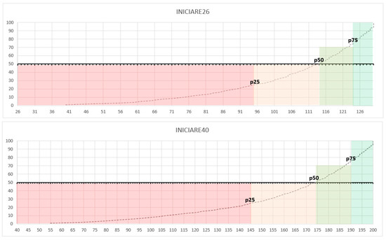 Percentile distribution Inventario del NIvel de Cuidados mediante Indicadores de Resultados de Enfermería (INICIARE)-26 and INICIARE-40.