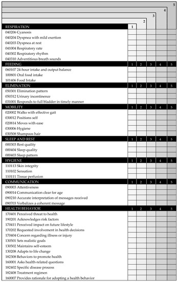 - Maas, M.; Johnson, M.; Moorhead, S.; Reed, D.; Sweeney, S. Evaluation of the reliability and validity of nursing outcomes classification patient outcomes and measures. J. Nurs. Meas. 2003, 11, 97–117. [Google Scholar] [CrossRef]