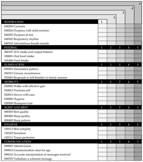 Referring to the instrument’s classification aforementioned [10], INICIARE Scale could be considered as a new group of instruments based on a novel approach using the standardized nursing language (SNL) systems to identify different patient dependency statuses, namely the Nursing Outcomes Classification (NOC). This SNL sets out a framework to develop outcomes sensitive to nursing interventions [15]. The NOC is sensitive to changes in the patient’s condition and facilitates the assessment and documentation of health outcomes [15,16]. In addition, it has a codified and taxonomic structure that has facilitated its integration into the health services information systems and the creation of Nursing Minimum Data Sets [17,18]. The NOC also overcomes the usual limitations of classification models that do not share the same definitions [18,19].