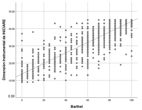 When the correlation between the Barthel index (BI) and INICIARE-40 is analyzed, a strong and positive value with the BI is obtained (rho = 0.77), which indicates that both scales measure similar concepts (Figure 8). However, when the BI only correlates with the instrumental dimension of INICIARE-40, the value increases up to 0.802, which indicates a greater conceptual similarity (Figure 9).