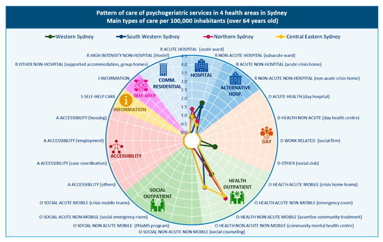 - Furst, M.A.; Salinas-Perez, J.A.; Hopman, K.; Bagheri, N.; Campos, W.; Gillespie, J.; Mendoza, J.; Salvador-Carulla, L. The Integrated Atlas of Psychosocial Care in the Western Sydney Primary Health Network Region; Centre for Mental Health Research, Australian National University: Canberra, Australia, 2019. [Google Scholar]