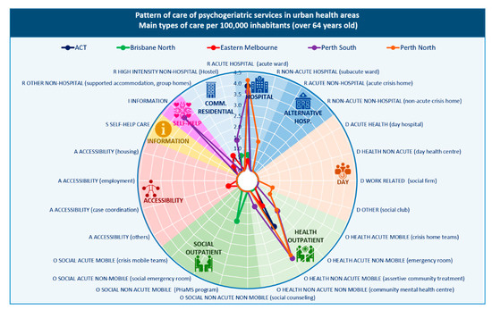 The pattern of care of mental health services available specifically for older people in the eleven Australian areas studied was characterised by a low diversity of care types, especially in rural areas; and a predominance of health-related care (i.e., hospital and outpatient care) over non-health (i.e., community residential and social support care). Moreover, we identified differences between rural and urban areas in hospital care with more diversified care available in the latter areas. Finally, the availability, capacity, balance of care and diversity of services for this age group is lower than that for children and adolescents, and for the general adult population. Thus, this study has detected care disparities and gaps between urban/rural areas and age groups that should be addressed by decision-makers. In order to understand whether these differences reflect inequities in care availability, relative technical efficiency analysis and comparative effectiveness analysis should be conducted using the exploratory data provided here [18].