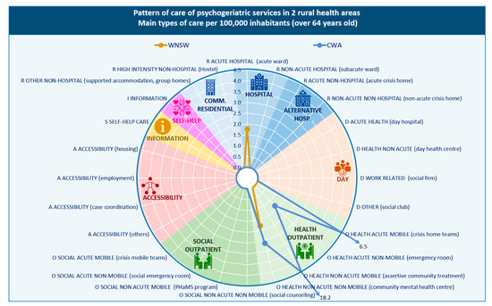 While there was a general lack of diversity of service types across all study areas, the gap in services was greater in rural areas than in urban areas. In CWA, which covers 33% of the Australian continent, the only rural services available were those providing outpatient health care, both mobile and centre based, with mobile services the more frequently available of the two. Similarly, WNSW had a lower diversity of care with only two types of care acute hospital care and community mental health care available. It is also important to note that mental health services in rural areas for this population were much less available than those for the general adult population: adult hospital care, residential community care, social support care, limited day care, and accessibility to care services were all more available in general adult mental health care [20,27]. This suggests that mental health service provision to older people has not been a priority in rural areas, or that it has been difficult to build and staff mental health services for them. There is an ongoing debate on whether specialised services in rural and remote areas should be prioritised over more general care mainly relying on “augmented” primary care reinforced by specialists. The 2018 Senate enquiry on “Accessibility and quality of mental health services in rural and remote Australia,” recognised that rural access to quality mental health care is a pressing national issue, but no specific mention was made of mental health services for older people [47]. Similarly, the Orange Declaration on Rural and Remote Mental Health warned against “an over-emphasis on specialist and hospital services” in rural and remote care [48]. In any case, the standard description of patterns of specialised care in rural and remote areas, and its international comparison are urgently needed to gather local and national evidence that may inform and optimise models of care in rural areas.