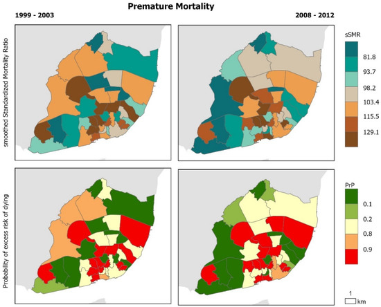 Premature Mortality in Lisbon Municipality. Smooth Standardized Mortality Ratio (sSMR) and probability of excess risk of dying (PrP), 1999–2003 and 2008–2012.