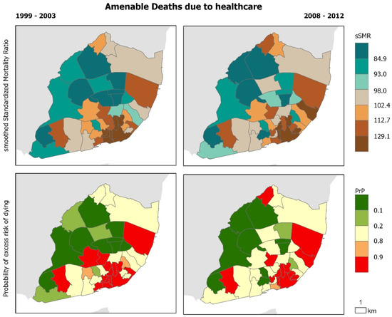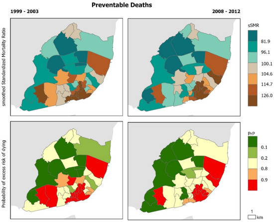 Preventable deaths in Lisbon Municipality. Smooth Standardized Mortality Ratio (sSMR) and probability of excess risk of dying (PrP), 1999–2003 and 2008–2012.