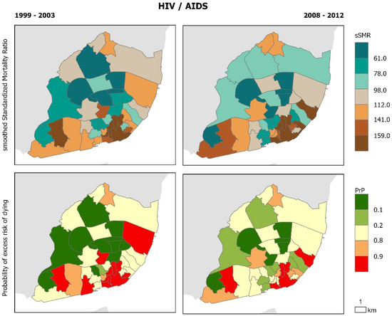 HIV/AIDS Mortality in Lisbon Municipality. Smooth Standardized Mortality Ratio (sSMR) and probability of excess risk of dying (PrP), 1999–2003 and 2008–2012.