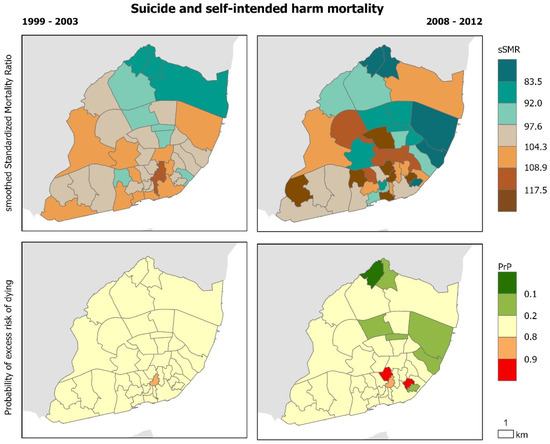 Suicide and self-intended harm Mortality in Lisbon Municipality. Smooth Standardized Mortality Ratio (sSMR) and probability of excess risk of dying (PrP), 1999–2003 and 2008–2012.
