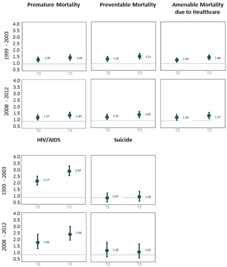 Figure 7 presents the outcomes of the ecological regression that provided evidence of the statistical association between material deprivation, in terciles, and cause-specific sSMR. All causes of death display a positive significant statistical association: the population living in the most deprived areas are at greater risk of dying from the analyzed causes. Suicide is the only exception. HIV/AIDS was the cause of death revealing a higher risk associated with deprivation in both periods: in the last period, the mortality risk was 144% higher in more deprived civil parishes than in their less deprived counterparts. During the crisis, the association between material deprivation and mortality decreased for premature, preventable, and amenable to healthcare deaths.