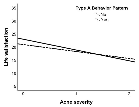 Contrary to hypothesis H3, TABP, as a dimensional continuous variable, was found not to be related to satisfaction with life in this study. However, using TABP as both a categorical dichotomous variable and as a continuous variable, we demonstrated that Type A personality may play a moderating role between acne severity and satisfaction with life. Therefore, the moderating role of TABP confirms hypothesis H3. TABP was previously considered a moderator of the stress response [90]. In the current sample of young female university students without acne, higher levels of TABP were related to higher life satisfaction. Conversely, among women with second-degree acne severity, those with higher TABP were less satisfied with life. It is likely that acne severity is an essential factor that determines the interaction with Type A personality and affects life satisfaction. Furthermore, a longitudinal study showed that global Type A behavior increased from adolescence to adulthood. Hintsa et al. [108] suggested that both life span and societal changes should be considered concurrently to fully understand the health consequences of TABP. Future research on the relationship between TABP and satisfaction with life should be conducted in people with acne of various ages from adolescence to late adulthood. More research is also necessary particularly among groups with higher acne severity levels than is presented in this study.