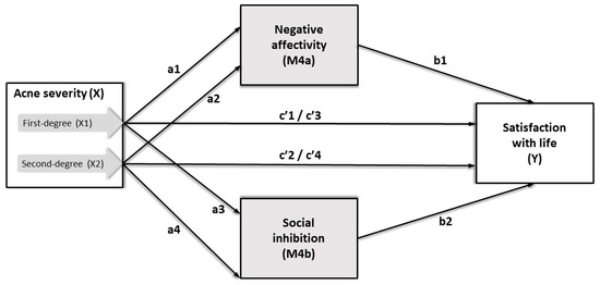 Two parallel multiple mediation analyses were conducted to examine the mediating role of both subscales of the DS14 (i.e., NA and SI) on the relationship between acne severity and satisfaction with life (Figure 2). The results of the Study Model 4a mediation analysis (Table 6, Figure S4, and Supplementary Materials) indicated that NA (M1) completely mediated the relationship between first-(X1) and second-degree (X2) acne severity and life satisfaction (Y). Female students with greater acne severity and higher scores in the NA subscale of the DS14 were less satisfied with life. The relative indirect effect of first-degree acne severity on satisfaction with life for negative affectivity as a mediator equaled Boot b = −1.59, Boot SE = 0.43, and Boot 95% CI(−2.43, −0.73). The relative indirect effect of second-degree acne severity on satisfaction with life for negative affectivity as a mediator equaled Boot b = −1.89, Boot SE = 0.55, and Boot 95% CI(−3.00, −0.83). The total variance of life satisfaction accounted for by Study Model 4a was 18%.