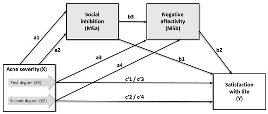 According to previous research [102], social inhibition modulates the effect of negative emotions on cardiac prognosis. Therefore, SI preceded NA in Study Model 5. The results of the Study Model 5 mediation analysis showed that both SI (M5a) and NA (M5b) completely mediated the relationship between first-(X1) and second-degree (X2) acne severity and satisfaction with life (Y). The relative indirect effect of first-degree acne severity on life satisfaction via SI and NA equaled Boot b = −0.43, Boot SE = 0.0,21, and Boot 95% CI(−0.82, −0.36). The relative indirect effect of second-degree acne severity on life satisfaction via SI and NA equaled Boot b = −0.57, Boot SE = 0.28, and Boot 95% CI(−1.13, −0.05). The total variance of life satisfaction accounted for by Study Model 5 increased to 20% compared to Study Model 4. Study Model 6 also explained 20% of life satisfaction variance, but moderated mediation was not confirmed, since the interaction coefficient was Boot b = 0.02, Boot SE = 0.01, and Boot 95% CI(−0.02, 0.03). Study Model 5 of the synergistic approach explained the higher percentage of life satisfaction variance and best fit the data compared to Study Models 2–4 and 6. More details are available in Supplementary Materials.