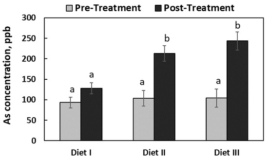 The concentrations of arsenic (As, as-is basis) in the feces of the pigs fed with three experimental diets. The rectangular bars represent the pattern of mean As concentrations in the feces before and after the feeding trial (pre- and post-treatment; n = 6 for Diet I, and n = 7 for Diets II and III). The error bars represent the pooled standard error of the means. The means labeled with different letters (a, b) differ (p < 0.05).
