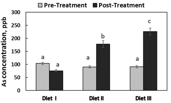 As shown in Figure 1, prior to the dietary treatment, there was no difference (p = 0.873) in fecal As concentrations (around 100 ppb) among the three groups of pigs. After the 6-week feeding trial, the fecal As concentration in Diet I pigs was 128 ± 26.4 ppb, which was not different (p > 0.100) from the concentration before the feeding trial. After the feeding trial, the As concentrations in Diets II and III pigs were increased (p = 0.003) to 213 ± 49.9 and 243 ± 54.3 ppb, respectively, and there was no difference (p = 0.975) in the As concentrations between the Diet II and Diet III pigs.