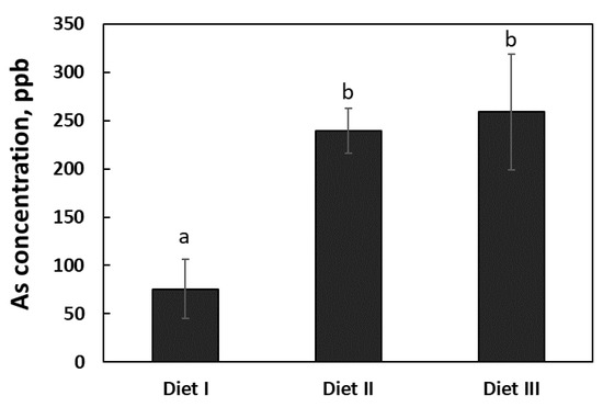 The concentrations of arsenic (As) in the urine of the pigs fed with three experimental diets. The rectangular bars represent the pattern of mean As concentrations in the urine after the feeding trial (n = 6 for Diet I, and n = 7 for Diets II and III). The error bars represent the pooled standard error of the means. The means labeled with different letters (a, b) differ (p < 0.05).