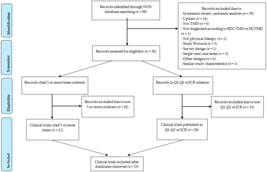 From a total of the 98 identified articles, 67 studies were excluded for not meeting the eligibility criteria, and one [31] because it was a duplication of another trial [32] with the same authors and similar study characteristics. One study was excluded because it did not use RDC/TMD or DC/TMD [33]. Finally, 12 clinical trials were included according to the citation criterion, and another 19 according to the JCR criterion. Eight of the articles fulfilled both criteria; therefore, the duplicates were removed.