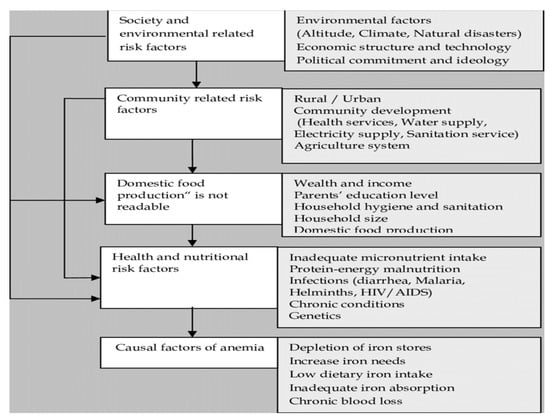 Socio-economic, demographic, health and environmental elements of living are known to be the contributing factors into anemia status. The framework (Figure 1) used to select the explanatory variables is similar to that used by Gaston et al., Kawo et al., and Ray et al. [10,26,28].