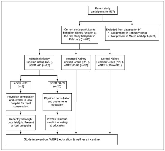 At the time of the study, the standard practice of the agribusiness was to screen sugarcane field workers pre-season and only allow those with an eGFR ≥ 60 mL/min per 1.73 m2 to be hired for field work. (Of note, the cutoff has since been increased to 90 mL/min per 1.73 m2.) By testing creatinine mid-season through the study time points, we identified workers who had dropped below their pre-harvest renal function. In addition to the study intervention, individual health interventions and education were provided to study workers in the AKF group by the Pantaleon medical staff (see Figure 1).