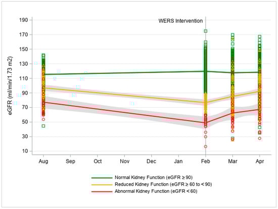 The value of occupational health screening depends, in part, on whether there are interventions that can halt or reverse clinical progression. The renal function of workers in the study appeared to benefit from the study WERS intervention and additional health, behavioral, and educational interventions. The workers in the RKF group who were found to have an eGFR between 60–89 mL/min per 1.73 m2 in February were shown to improve their renal function with WERS behavioral and educational interventions, when compared to their trajectories of decline before the intervention. Workers found to have an eGFR < 60 mL/min per 1.73 m2 in February also showed reversal of a trajectory of decline after the intervention was implemented. Workers who maintained normal kidney function before and during the season maintained kidney function pre- and post-intervention. However, since there was no group in our study that did not receive the intervention we cannot confirm whether the intervention contributed to the stable kidney function throughout the harvest. The success of this intervention among workers with reduced and abnormal kidney function suggests that efforts to increase hydration (as well as rest) may be important in slowing kidney decline among workers [].