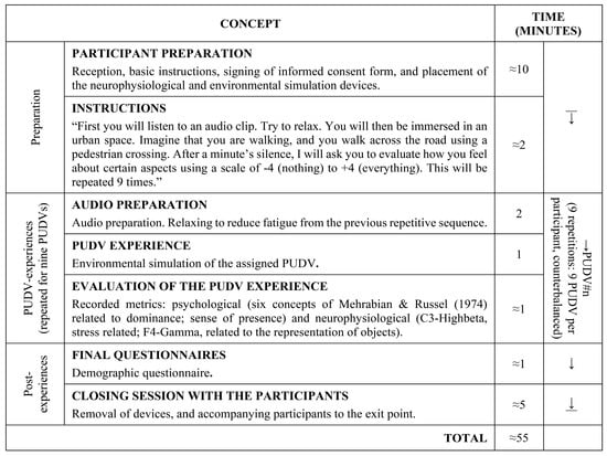 All participants experienced nine different PUDVs. Of these, 3 were of natural light variable “day”, and 6 of natural light variable “night” (thus maintaining a consistent proportion of daytime and night-time PUDVs for all participants). The daytime experience PUDV # B (the base stimulus) was taken as a reference to normalize the psychological and neurophysiological metrics used in each case. Following this, all the experiences were randomized.