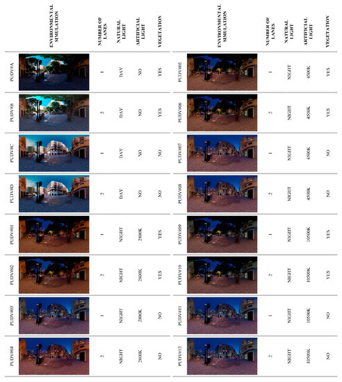 The PUDVs were configured on the following basis. To guarantee the exhaustiveness of the study and that it is a work that can be addressed, four variables were studied: (1) “number of lanes”, (2) “natural lighting”, (3) “artificial lighting”, and (4) “vegetation”. The parameters for each were: number of lanes (1a) “1 lane”, and (1b) “2 lanes”; for natural lighting (2a) “day”, and (2b) “night”; for artificial lighting, colour temperatures of (3a) “2800 K”, (3b) “4500 K”, and (3c) “10,500 K”; and for vegetation (4a) “trees”, and (4b) “no-trees”. The combination of these resulted in 16 PUDVs (Figure 3).