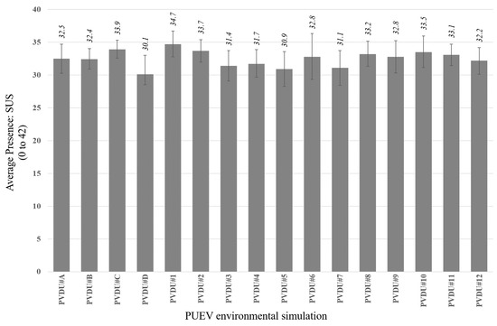 The average levels of sensation of presence per participant (according to the SUS questionnaire) for each environmental simulation were obtained (Figure 4). As the SUS questionnaire is made up of 6 items to be assessed on a 7-point Likert-type scale, the maximum presence level would be 42 points. They were considered to be sufficient, taking into account the results obtained by studies using similar technologies [54]. As such, the simulations can be considered satisfactory.