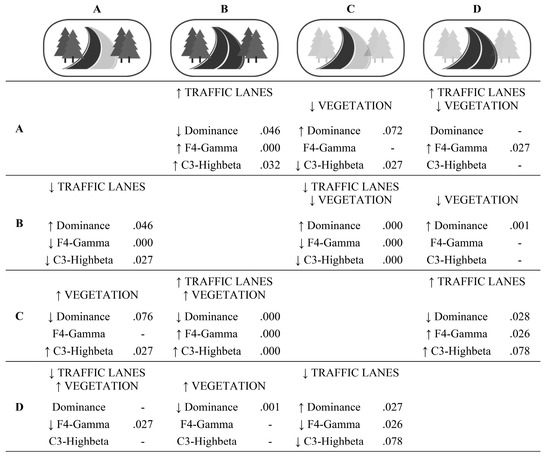 The following analysis shows the effect that different interventions had on each of the scenarios. Overall, the Kruskal-Wallis test showed significant differences between the four scenarios. Scenario C (without vegetation, and with fewer traffic lanes) generated a higher level of dominance and lower levels in the stress-related metric C3-Highbeta, and the metric related to the representation of objects, “F4 -Gamma”. On the other hand, scenario B (with vegetation, and with more traffic lanes) generated lower levels in the dominance metric and higher in the C3-Highbeta and F4-Gamma metrics. Table 8 shows these results.