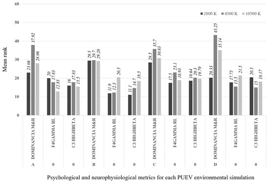 To compare the metrics related to the perception of safety among the different PUDVs, taking into account that the variables do not follow a normal distribution (K-S Test, p < 0.05), the Kruskal-Wallis test is applied because variable lighting colour temperature has three categories. The Kruskal-Wallis test detected significant differences for the dominance metric (p = 0.000). The lowest level of dominance corresponded to a temperature of 2800 K, with a mean rank attitude score of 99.03. No significant differences were detected in the neurophysiological variables (p > 0.05). Table 3 shows these results.