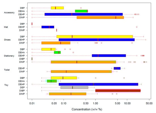 Among the analyzed 3345 products, at least one plasticizer was determined above the detection limit in 387 products, and only one plasticizer was determined in 286 products. DEP was the only chemical used singularly in 10 toys, but DEHP was found in all samples containing more than 1 plasticizer with the exceptions of two products in shoes category in which the combination of DINP and DBP was found. The most frequently detected plasticizer was DEHP in 264 products, followed by DINP (n = 141), DBP (n = 66), DEHA (n = 30), DIBP (n = 14), and DEP (n = 10). DEHP was found in all product categories. Figure 1 presents the range of plasticizer contents in six product categories in which each plasticizer was detected. In accessories, the highest concentrations of DBP, DEHA, DEHP, and DINP were 0.35, 0.59, 22.90, and 15.52% (w/w), respectively. In mat, the highest concentrations of DBP, DEHP, and DINP were 0.01, 20.13, and 0.06% (w/w), respectively. In shoes, the highest concentrations of DBP, DEHP, and DINP were 33.12, 38.95, and 14.34% (w/w), respectively. In stationery, the highest concentrations of DBP, DEHA, DEHP, DIBP, and DINP were 0.16, 0.20, 33.68, 0.01, and 40.52% (w/w), respectively. In toilet, the highest concentrations of DEHP and DINP were 8.41, and 4.83% (w/w), respectively. In toy, the highest concentrations of DBP, DEHA, DEHP, DEP, DIBP, and DINP were 8.03, 0.08, 28.11, 0.92, 27.20, and 4.68% (w/w), respectively. The highest concentration of plasticizer in analyzed products was 40.52% (w/w) of DINP in an eraser in the stationery category. The concentrations of DEHP were relatively high in all categories but not always the highest. The high detection frequency and concentration of DEHP might be associated with its good performance as a plasticizer and relatively low price [,].