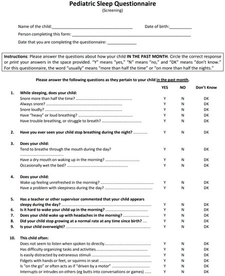 - Chervin, R.D.; Weatherly, R.A.; Garetz, S.L.; Ruzicka, D.L.; Giordani, D.L.; Hodges, E.K.; Dillon, J.E.; Guire, K.E. Pediatric Sleep Questionnaire: Prediction of Sleep Apnea and Outcomes. Arch. Otolaryngol. Head Neck Surg. 2007, 133, 216–222. [Google Scholar] [CrossRef]
