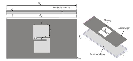 The layout and geometrical dimensions of the proposed patch with a five-shaped slot tag are respectively given in Figure 1 and Table 1. The tag antenna is designed by using 0.035 mm of adhesive copper and 1 mm of the bio-silicone substrate with relative permittivity of 2.5 and conductivity of 0.005 S/m at 915 MHz. The antenna geometrical parameters are given in Table 1.