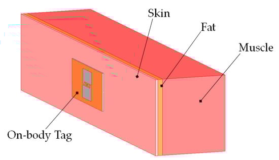 The conceived tag includes a patch radiator with five shaped slots. The choice impacts the antenna impedance and permits to achieve an inductive reactance. It also protects the antenna from the radiation losses caused by human skin. It includes an NXP UCODE G2XM microchip with complex impedance (Z = 34-j 142 Ω) []. Moreover, the proposed sensor tag will be placed around the human arm’s layered anatomical phantom at 915 MHz. This model consists of stratified parallelepiped boxes with defined properties such as thickness, dielectric constant, and conductivity.
