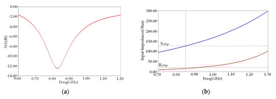 (a) Reflection coefficient S11 and (b) antenna input impedance versus frequency of conventional tag.