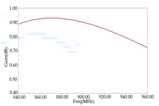 The maximum gain extracted from Figure 8 has a value of 2.27 dB at around 882 MHz. This value is higher than that of a conventional tag (0.92 dB) obtained at the frequency 865 MHz. At this frequency (865 MHz) of our gain is around 0.92 dB.