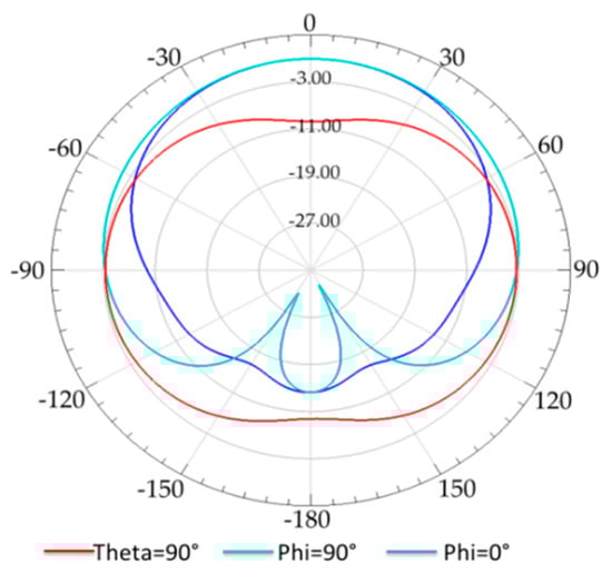 As depicted in Figure 15a,b, the electric field presents a peak in the antenna’s center. In contrast, the magnetic field distribution shows the peak in the antenna center, along the two feeding lines and close to the antenna border toward the y-axis (Figure 15b). According to the reference [], to choose the direction of optimal ground plane extension, the ground plane’s enlargement must follow the region of the high distribution of the electric field.