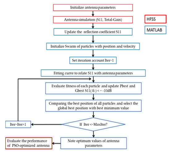 A detailed flowchart of the PSO technique for the antenna parameters optimization is shown in Figure 6.