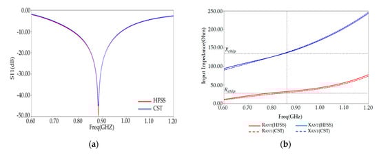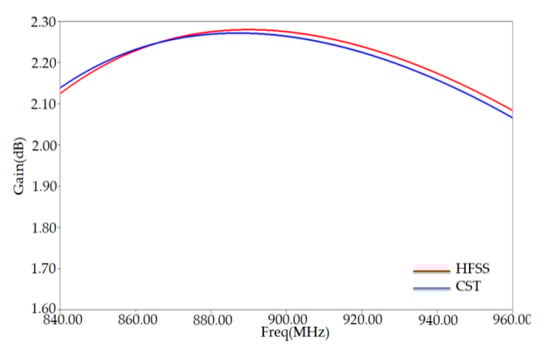 In the following, we investigated an optimized tag antenna’s performance using both HFSS and CST simulation tools. The reflection coefficient S11 and total-gain against the frequency are respectively shown in Figure 18a,b. Here, we also notice that both solvers give similar results. The reflection coefficient S11 has a maximum of S11 = −32.85 dB at frequency resonance of 878 MHz. The extracted maximum gain from Figure 18b has a value of 1.82 dB around 878 MHz.