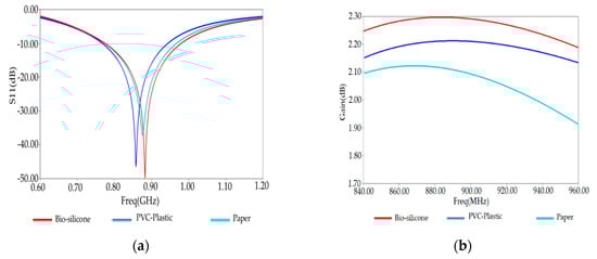 Effects of materials on impedance matching and radiation performances of the proposed antenna have been investigated. Figure 9a,b shows respectively the reflection coefficient of the antenna for different substrates materials, Bio-silicone, PVC-plastic (ε = 2.7, loss = 0.007), and paper (ε = 3.2, loss tangent = 0.05) at 915 MHz. Remarkably, the conceived antenna with bio-silicone substrate presents good radiation performances and well-matching features.