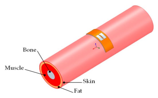 The electrical properties of the human arm (skin, fat, muscle) phantom at 915 MHz are shown in Table 2 []. A numerical phantom has been added to the simulation scenario to analyze the body–antenna coupling. We have chosen a three-layer model, composed of a skin layer (2-mm thick), a fat layer (4-mm thick), and a muscle layer (54-mm thick) (see Figure 2) [].