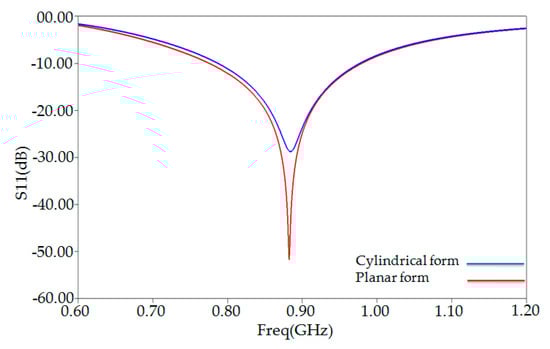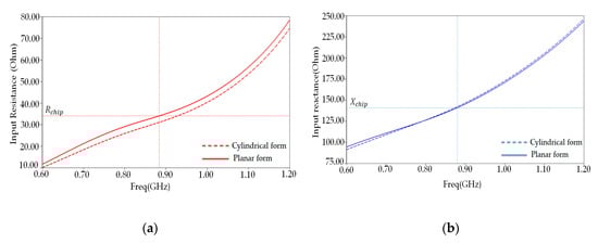 This model helps us to see what happens to the antenna characteristics compared to the planar model. Figure 11 shows the proposed antenna’s simulated reflection coefficient when the antenna is simply in planar form and when it is bent to conform to a cylindrical human arm model. As depicted in this figure, bending the proposed tag antenna will only slightly affect the impedance matching, clearly explained in Figure 12a,b, showing a deviated somewhat input resistance value around 882 MHz, whereas its corresponding reactance remains unchanged. As shown in Figure 12, the proposed antenna value (37 ohms) input resistance around the resonance frequency is slightly deviated, whereas its corresponding reactance (142 ohms) stays unchanged.