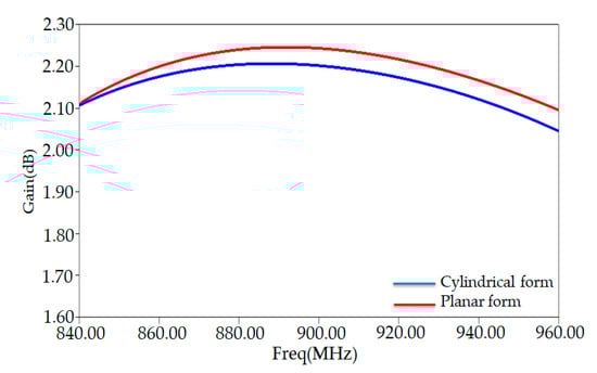 Figure 13 shows the comparison of gain between the antenna in planar and bending form. As depicted in Figure 13, the obtained gain is not affected by bending the tag antenna structure—nearly similar results obtained from these two models.
