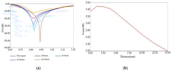 (a) Simulated antenna reflection coefficient S11 and (b) Realized-Gain for a various distances from human arm phantom at 882 MHz.