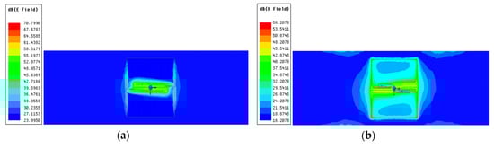 The electric and magnetic field distribution of the antenna, simulated in the bio-silicone dielectric ground plane, are shown respectively in Figure 15a,b for the case when the antenna is placed directly on the human body and at the resonance frequency of the antenna (882 MHz).