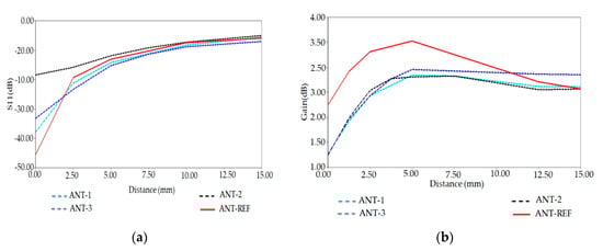 From the simulation results presented in Figure 17a,b, we see that the ANT-REF profile is better and then the ANT-1, ANT-2, and ANT-3 in terms of reflection coefficient and gain. The reflection coefficient and realized-gain of Ant-REF versus the distance from the human arm phantom reached the value of −50 dB and 3.5 dB, respectively.