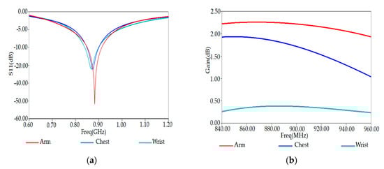 One can notice that the gain in arm and chest phantoms is much higher than that obtained in the wrist phantom. This can be related to the high water content in fat tissues in the arm and chest compared to the wrist. The gains obtained in the three cases (arm, wrist, and chest) are still higher, improving our wearable tag’s good functionality near the human body model [,,].